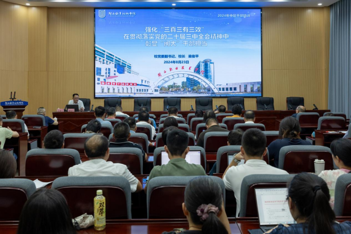 在学校贯彻落实“十四五”规划任务之际,在全体师生凝心聚力迎接省“双高”验收评估的关键节点,学校举办此次培训班,恰逢其时、意义重大。8月23日下午,学校党委副书记、校长梁俊平教授为参训干部作题为《强化“三真三有三效”,在贯彻落实党的二十届三中全会精神中彰显“闽大”干部担当》并主持培训班闭学式。会上,梁俊平校长指出,学校正处于爬坡过坎的关键发展时期,面临的发展机遇前所未有,挑战也前所未有,不进则退、慢进亦退,领导干部在工作落实上一定要“真有效”。他强调,学校领导干部在作风建设上要“真转、真改、真做”,落实工作时要心中“有数”、手中“有解”、肩上“有为”,工作落实要有重实效、求实效、显实效。梁俊平校长对党的二十届三中全会中释放出的关于新时代职教改革的重要信号进行深入解读,指出学校发展需要紧跟国家改革步伐,闽大干部要“因势而谋、应势而动、顺势而为”,围绕教育强国建设的主战场找准新赛道,打好地方经济社会发展特色和高校资源优势的组合拳,坚定不移地推进现代职业教育体系的闽大实践。