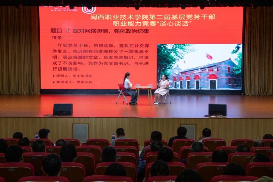 10月21日在大匠堂举办第二、三阶段竞赛,以“建设教育强国”为主题,举行“微党课”讲授与“谈心谈话”情景模拟竞赛。