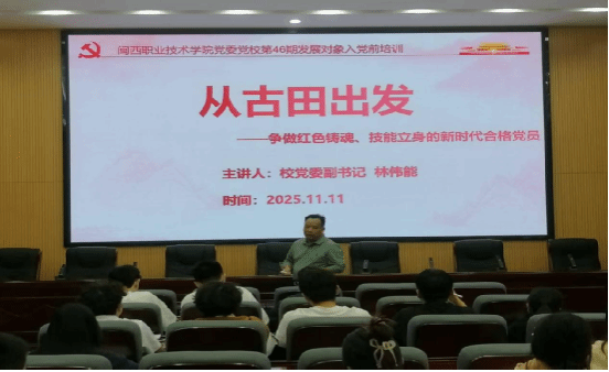 党校校长、党委副书记林伟能以《从古田出发——争做红色铸魂、技能立身的新时代合格党员》为题讲授开班第一课,通过“四个维度”串联历史与现实。他指出,作为闽西高职生,红色基因在我们血脉里,专业技能在我们手里,希望大家从古田出发,做懂历史、懂精神、懂传承、懂践行的新时代党员,用技能把家乡建设得更好!
