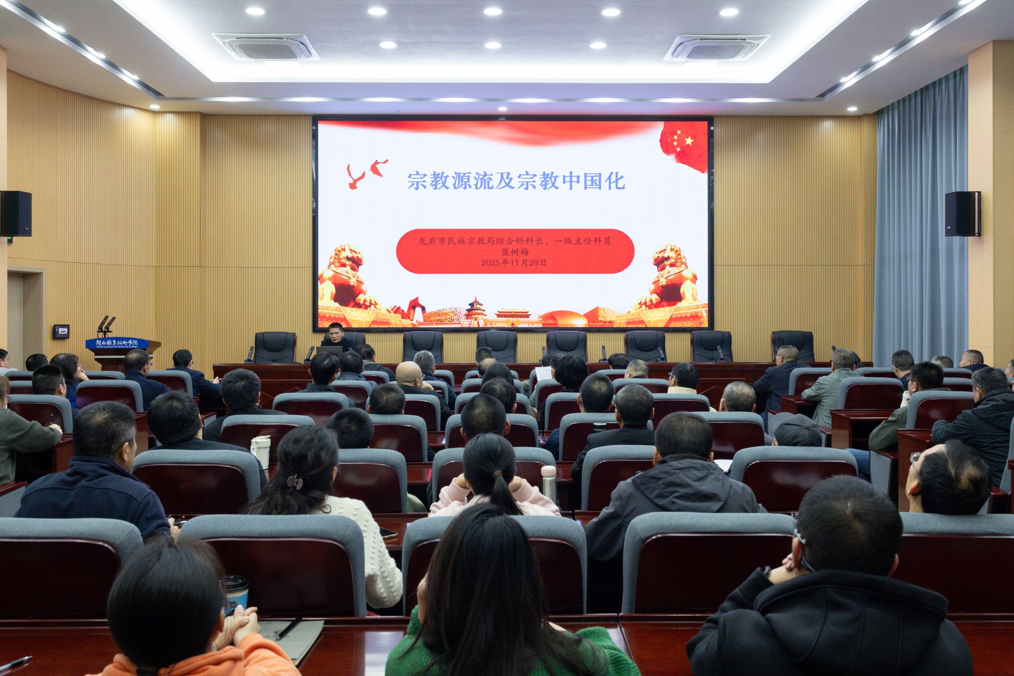 本次培训聚焦理论深化与能力提升,内容涵盖党的二十届四中全会精神专题辅导、“十五五”规划编制、宗教、网络意识形态、保密、廉政和作风教育等。周末两日,学校特邀福建青年讲师团成员、龙岩市委讲师团宣讲一室主任林爱清为全体参训干部作《乘势而上,接续推进中国式现代化建设——深入学习党的二十届四中全会精神》专题讲座,对中国式现代化的内涵特征与实践要求进行了系统宣讲和深入阐释。龙岩市民族与宗教事务局综合科科长、一级主任科员蓝树梅围绕宗教工作作专题辅导,进一步深化了参训干部对宗教工作的认识和宗教政策法规等理论知识的理解,为准确把握工作方向、精准施策提供了有力的指导。龙岩市委网信办副主任龚祖灿结合丰富的工作案例,系统地讲解了网络舆情处置与引导的实战方法,为参训干部落实落细网络意识形态工作责任制,做好新时代高校网络舆情应急与处置提供了清晰的思路和有益的借鉴。