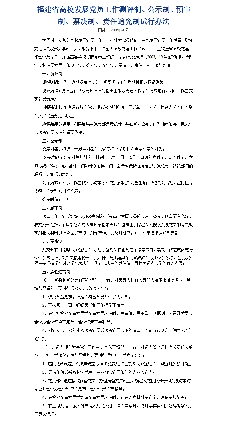 福建省高校发展党员工作测评制、公示制、预审制、票决制、责任追究制试行办法