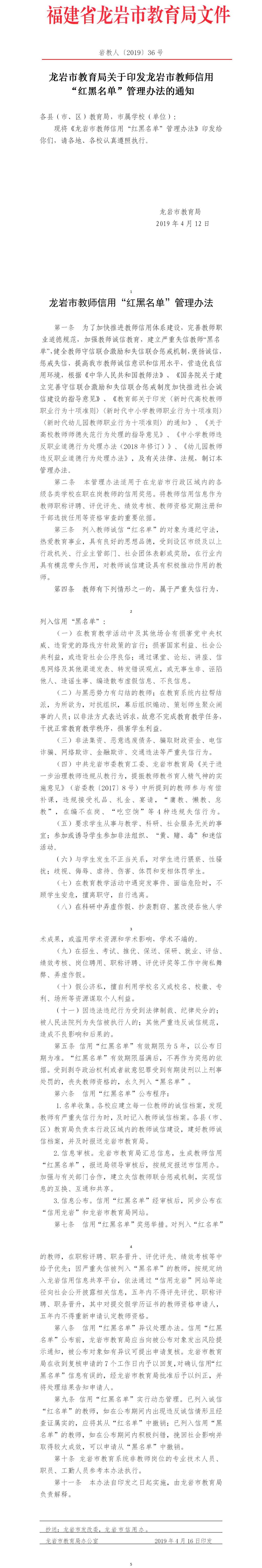 龙岩市教育局关于印发龙岩市教师信用“红黑名单”管理办法的通知