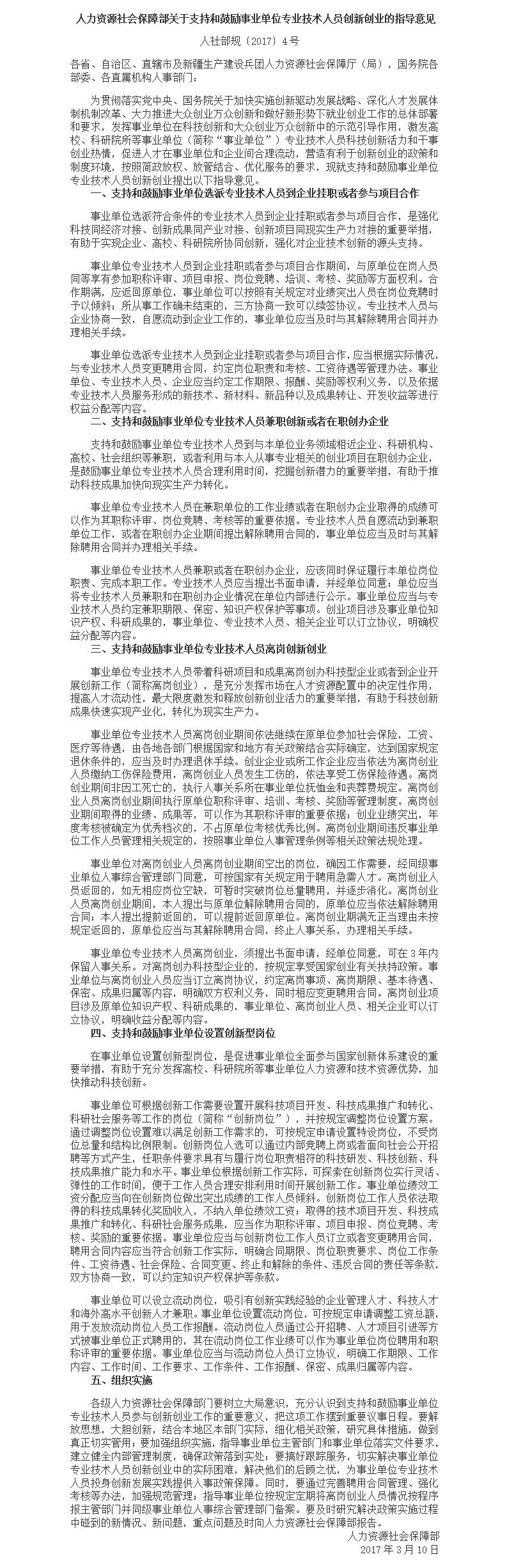 人力资源社会保障部关于支持和鼓励事业单位专业技术人员创新创业的指导意见