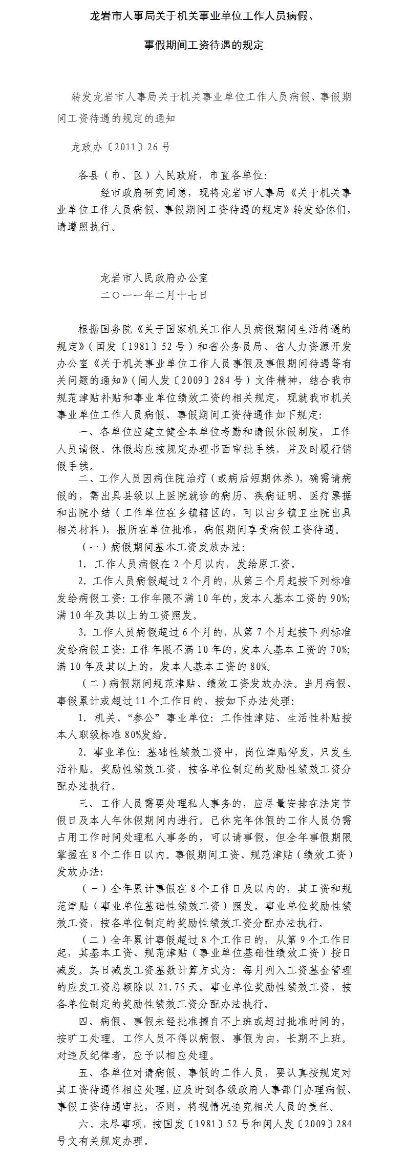 龙岩市人事局关于机关事业单位工作人员病假事假期间工资待遇的规定
