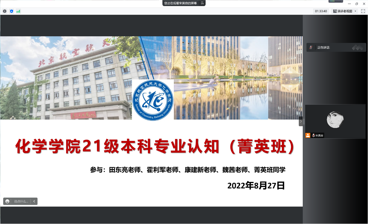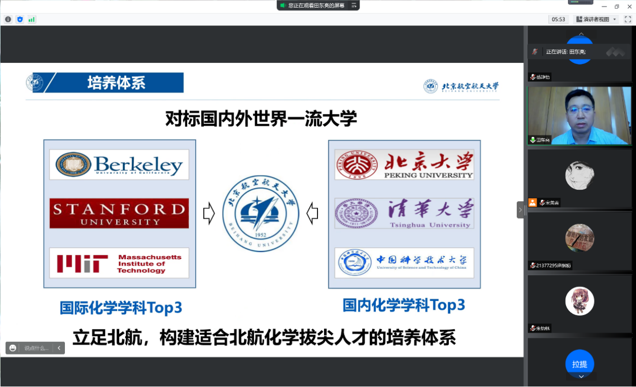 8月28日,3044永利集团官网2021级菁英班开展系列专业认知教育活动。上午9:00,专业认知大会以腾讯会议的形式召开。本科教学副院长田东亮老师、化学生物学专业负责人霍利军老师、应用化学系康建新老师、院团委书记魏茜老师与菁英班全体同学参加了此次会议。