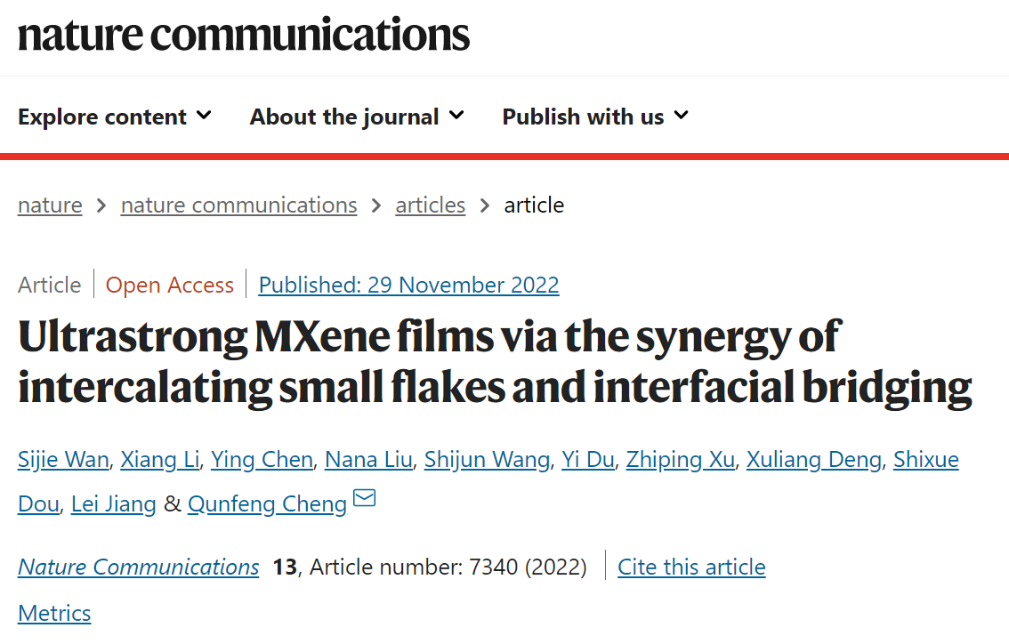 2022年11月29日,《Nature Communications》在线刊登了永利3044永利集团官网程群峰教授课题组的最新研究成果“小片填充和界面交联协同致密化的超强MXene薄膜”(英译:Ultrastrong MXene films via the synergy of intercalating small flakes and interfacial bridging),永利3044永利集团官网万思杰副教授、李响、北大口腔医院第一门诊部陈英博士、永利物理学院刘娜娜博士为第一作者,程群峰教授为通讯作者,3044永利集团官网为第一完成单位。