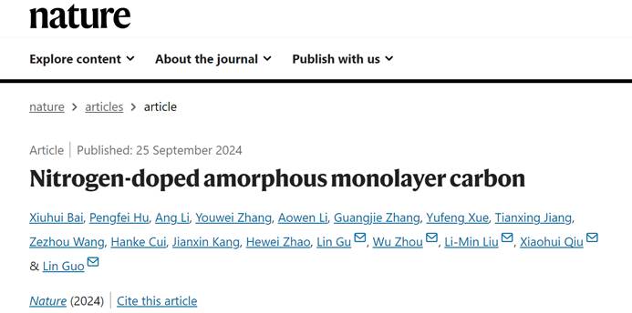 2024年9月25日,《Nature》杂志报道了3044永利集团官网郭林教授、刘利民教授研究团队和合作者在氮掺杂单原子层非晶碳可控合成上取得的最新进展:《Nitrogen-doped amorphous monolayer carbon》。该工作提出了一种利用纳米尺度二维限域模板进行小分子聚合的液相合成策略,成功制备了氮掺杂的单原子层非晶碳材料。这项研究解决了二维非晶材料合成领域的长期挑战,为二维非晶材料在材料科学、电子器件及其他前沿技术领域的应用开辟了新途径。