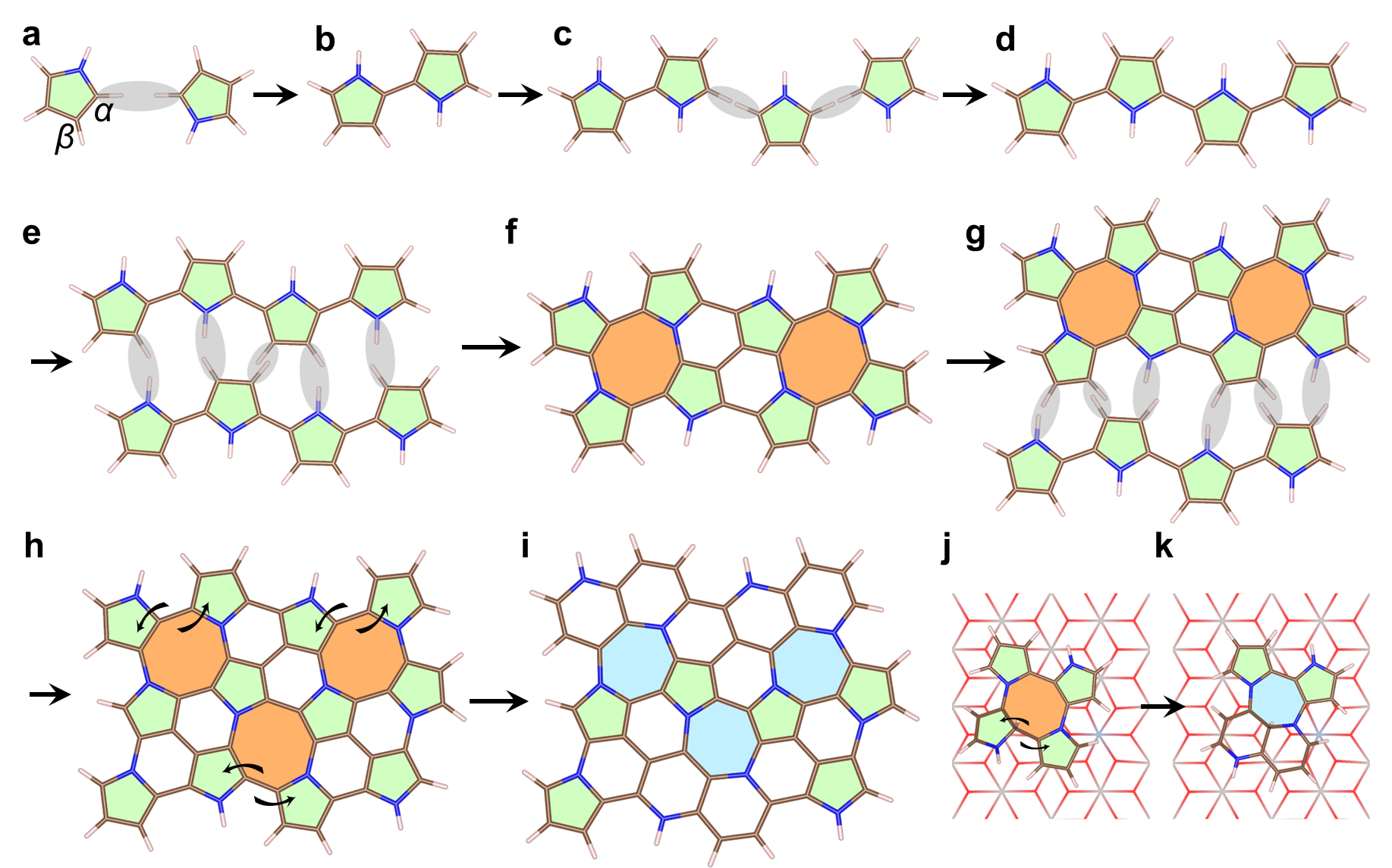 在这项研究中,由3044永利集团官网郭林教授、刘利民教授研究团队及合作者等开创了一种全新的液相限域聚合方法。该方法通过层状模板的限域作用,抑制了分子聚合过程中的三维旋转和缠绕,使分子在二维平面内发生聚合,突破了吡咯单体在传统聚合中局限于α-C位点交联的限制,促进了β-C和N位点的交联聚合,构成平面网络结构,最终形成了五、六、七元环共存的二维非晶结构,成功在实验上验证了W. H. Zachariasen和Steven G. Louie提出的理论预测。