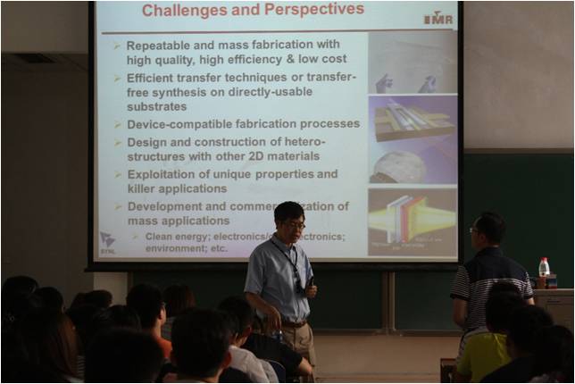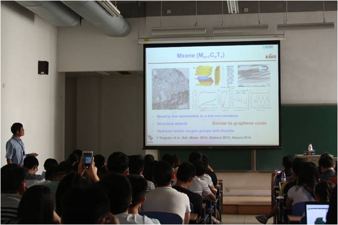 成会明院士热情邀请在场师生同中国科学院金属研究所、中国科大材料学院展开合作交流,然后进入了报告的主题:石墨烯等二维材料的制备与应用探索。首先简要介绍了石墨烯的结构和性质,又重点阐述了在石墨烯和其他二维材料的制备和应用探索方面的研究进展。成会明院士课题组发展了化学剥离方法和CVD方法制备出高质量石墨烯微片、毫米尺寸的六角形石墨烯单晶体与石墨烯三维网络结构宏观体,并实现了针对储能和柔性器件等方面的应用,同时考察了石墨烯材料在柔性触控屏、锂离子电池、锂-硫电池、电磁屏蔽材料、弹性导体、散热材料等方面的应用。此外,成会明院士课题组采用CVD方法制备出高质量过渡金属硫化物、碳化物等二维晶体材料,发现它们具有一些独特的性质,这些进展将有望推动石墨烯等高性能二维材料的发展及实际应用。