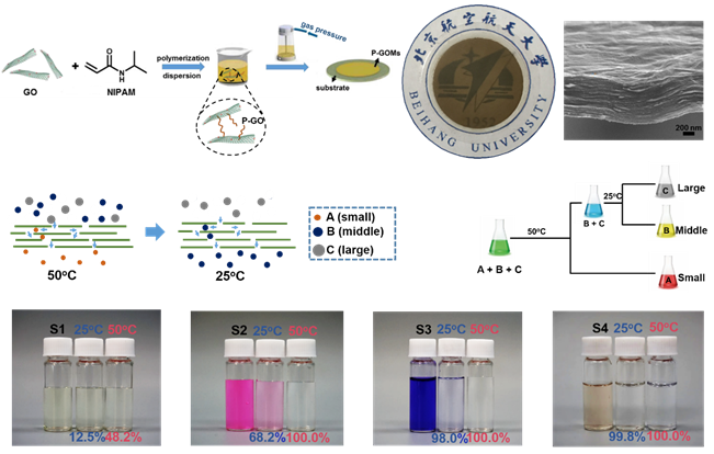 膜分离作为选择性分离领域的一种手段,在工业生产和日常生活中起着不可替代的作用。近年来,快速的城市化和工业化进程,工业污水的肆意排放和洁净生活饮用水的匮乏,让持续枯竭的淡水资源的形势变得愈发严峻。以分离膜技术为代表的解决方案,引起了广泛地关注和重视。永利3044永利集团官网赵勇教授、王女副教授课题组近年来在高效液体分离膜领域取得一系列进展:使用静电纺丝技术结合其它合成手段制备了浸润性可调的纳米纤维膜,可用于高效油污吸附分离(Nanoscale2015,7, 2625);利用二元协同互补理念制备了大通量连续化油水分离器(J.Mater. Chem. A, 2016,4, 4365);使用静电纺丝技术及水热合成的方法,仿生制备了具有树枝状多级结构的无机纤维膜,可实现高效乳液的分离(J.Mater. Chem. A, 2016, 4, 12014;J.Mater. Chem. A, 2017, 5, 16134);通过构筑具有多尺度结构网膜并精确调节其表面能,实现了基于有机液体表面张力差异的非水体系混合有机液体分离(NPGAsia Mater.2016, 8, e334;Small,2017, 13, 4)。在前期多相液体分离膜工作的基础上,赵勇教授、王女副教授课题组进一步制备了具有仿生温度响应的石墨烯分离膜用于水门控及混合分子分离。在之前研究中,氧化石墨烯分离膜的孔径无法实现简单的原位调控,从而限制了其应用。该工作从自然界中获得灵感,模仿植物(如仙人掌)叶片在高温下气孔关闭调节水蒸发通量从而维持生命这一功能特性,仿生构筑了“高温闭孔,低温开孔”的氧化石墨烯膜。作者通过自由基聚合反应将温敏性高分子聚(N-异丙基丙烯酰胺)与氧化石墨烯共价连接,制备了孔径可受温度原位调控的氧化石墨烯分离膜。该分离膜在纳滤尺度上表现出优异的性质,并且通过其温度响应性质可实现不同尺寸混合分子的梯度分离。此研究拓展了智能响应分离膜的应用领域,为水净化、精细化工分离等提供了新的处理思路,同时该膜在微流控及智能反应器领域均有着潜在的应用。