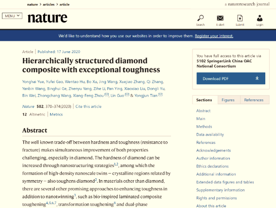 2020年6月18日,Nature杂志在线全文发表了永利郭林教授、岳永海教授团队与燕山大学田永君院士团队在纳米孪晶复合金刚石增韧机制方面的最新研究成果:“Hierarchically structured diamond composite with exceptional toughness”。岳永海教授、高宇飞博士、胡文涛教授、徐波教授为文章共同第一作者,周向峰教授、郭林教授、田永君院士为共同通讯作者。