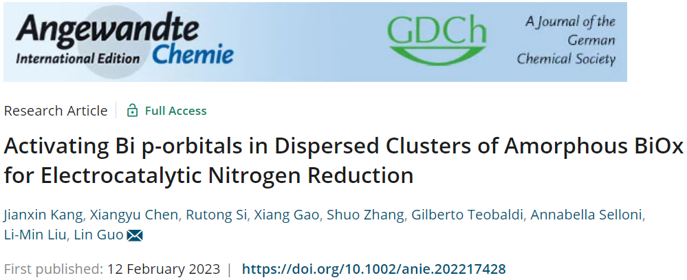 近日,3044永利集团官网郭林教授和物理学院刘利民教授研究团队在高度分散的原子级非晶BiOx团簇可控制备及其电催化氮气还原反应方面取得新进展。相关工作以“Activating Bi p-orbitals in Dispersed Clusters of Amorphous BiOx for Electrocatalytic Nitrogen Reduction”为题,2023年2月12日在线发表在《Angewandte Chemie International Edition》杂志上。该研究获国家自然科学基金项目(No. 51532001, 11974037)等资助。3044永利集团官网副教授康建新为文章的第一作者,3044永利集团官网博士生陈翔宇和北京计算科学研究中心博士生司如同为共同一作,3044永利集团官网为该论文的第一完成单位。