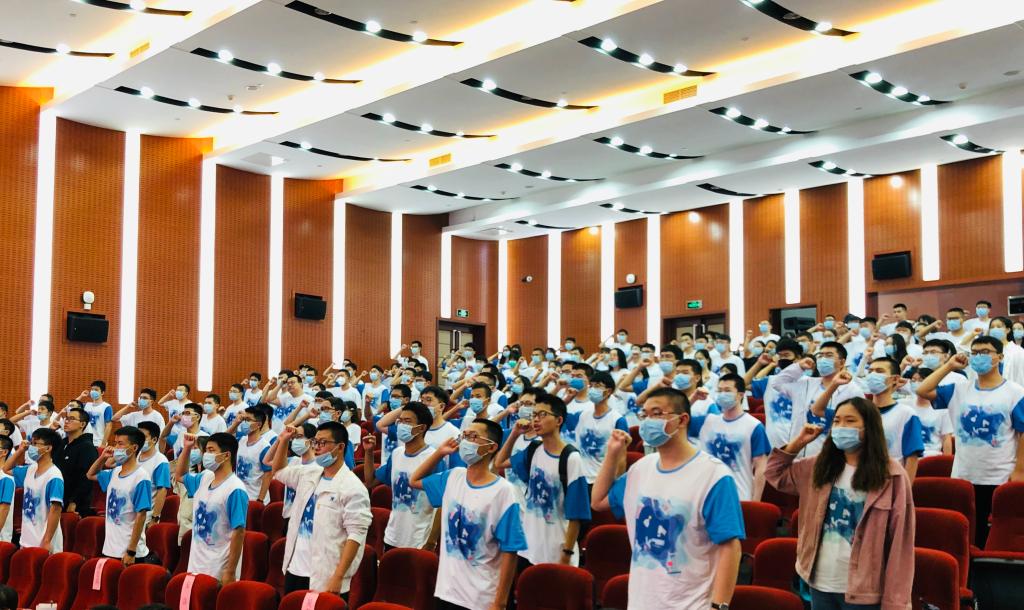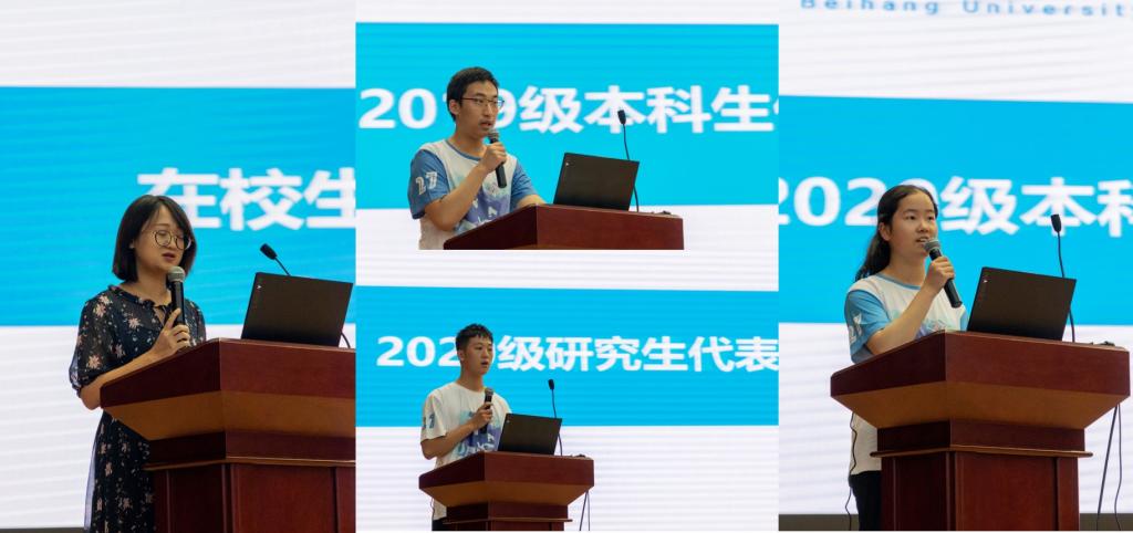 随后,4名学生代表发言:在校生代表2018级博士张秋雅向师弟师妹们分享自己在本科、硕士和博士在三个不同阶段对科研的感受,并提出一些中肯的建议,做科研要不畏艰难和挑战,敢于尝试,勤思考;2019级本科生代表王泽文同学和2020级本科生代表刘栖熙同学表示对未来更好发展的期待和决心;2020级研究生新生代表李国正同学也表达了对北航的向往并表示作为“北航化院人”要有担当,志向和梦想。在李国正同学的领誓下,全体2020级新生进行集体宣誓。