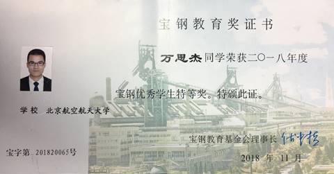 日前,永利博士研究生万思杰同学荣获2018年度宝钢优秀学生特等奖。经过学院及学校层层选拔,万思杰同学作为学校唯一一名学生代表,参加了宝钢优秀学生特等奖评审,并最终获得该奖项。