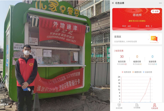 蒋晓辉是永利2018级的研究生,也是一名入党积极分子,当他听说社区需要志愿者的时候,就主动报名加入到了“天津市建新里志愿服务团队”中。他说:“国家遭受疫情冲击,每天都有大量的医生和护士团队驰援武汉,大量的党员战士们冲锋在战斗一线,他们是最美的逆行者,让我深深敬佩,作为青年人,我也想为抗击疫情出一份力,可我既不是医生,也买不到口罩可以捐赠,所以看到社区招募志愿者的消息,我就马上报名了,希望能为抗击疫情贡献自己的绵薄之力!”